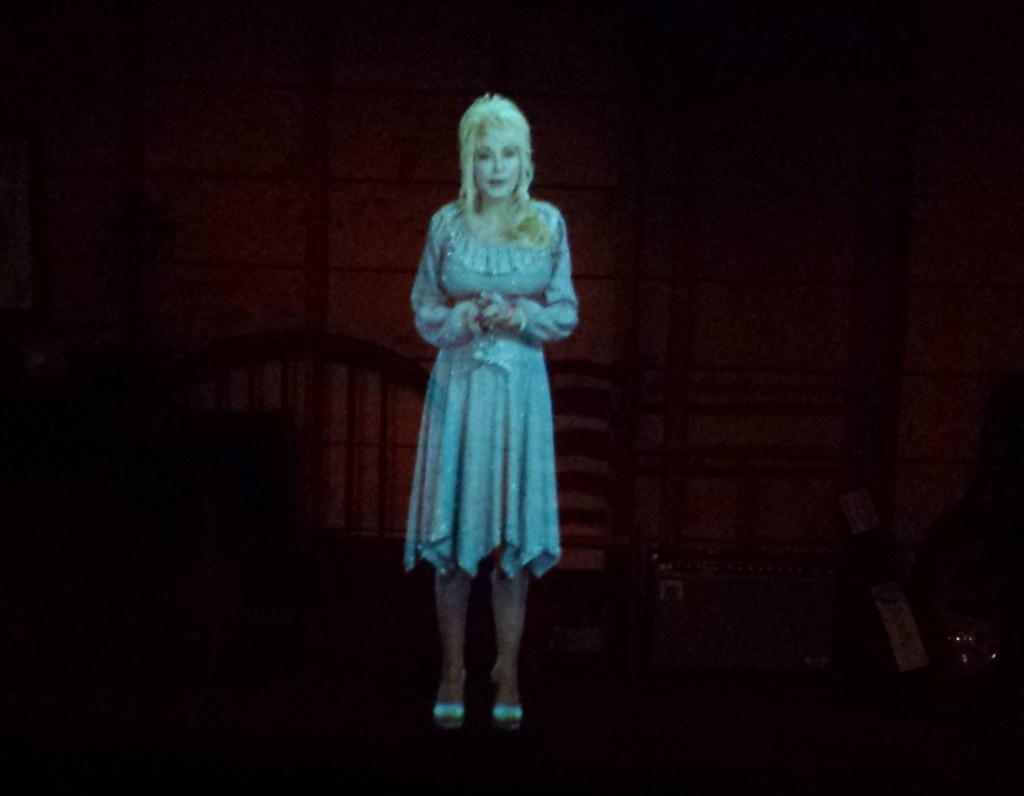After satisfying our curiosity about the bus, we stepped inside the museum and were directed to the top floor, where Dolly (in hologram form) welcomed us to her world. That part of the museum is a re-creation of the mountain cabin she grew up in; on one wall was a list of the 12 or so kids in her family, with their birthdays next to their name — Dolly can’t lie about her age (not that she ever has)! It was also complete with family photos, including several of her with Carl Dean, her reclusive husband.