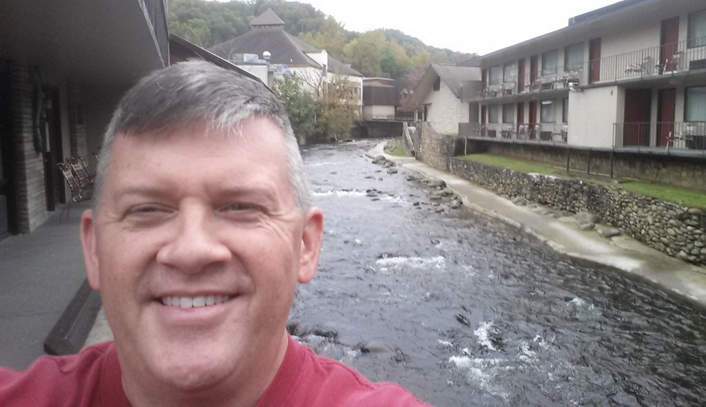The second memory is more nerve-wracking. Our hotel in Gatlinburg — the Best Western Twin Islands — was a charming property with Little Pigeon River running through it; some of the buildings, including ours, were on the river, and the walkway to our ground-level room overlooked the water. It rained off and on in Gatlinburg that week — it rained a LOT. The Little Pigeon River turned into a rushing, noisy torrent of water that rose to just a few feet below the walkway. Ron and I watched the river apprehensively, thinking that we might have to make a break for it, but the rain eventually stopped and the water subsided.