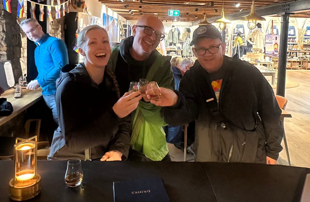 After spending about 30 minutes there, Driver Andrew took us to Talisker Distillery, where (almost) everyone enjoyed a drop of whisky in their modern tasting room (again, calming the whisky with a few drops of water). Blythe, a parachute packer from Tucson that we hung out with, explained different types of whisky to Ron as he and I sampled their 10-year-old vintage.