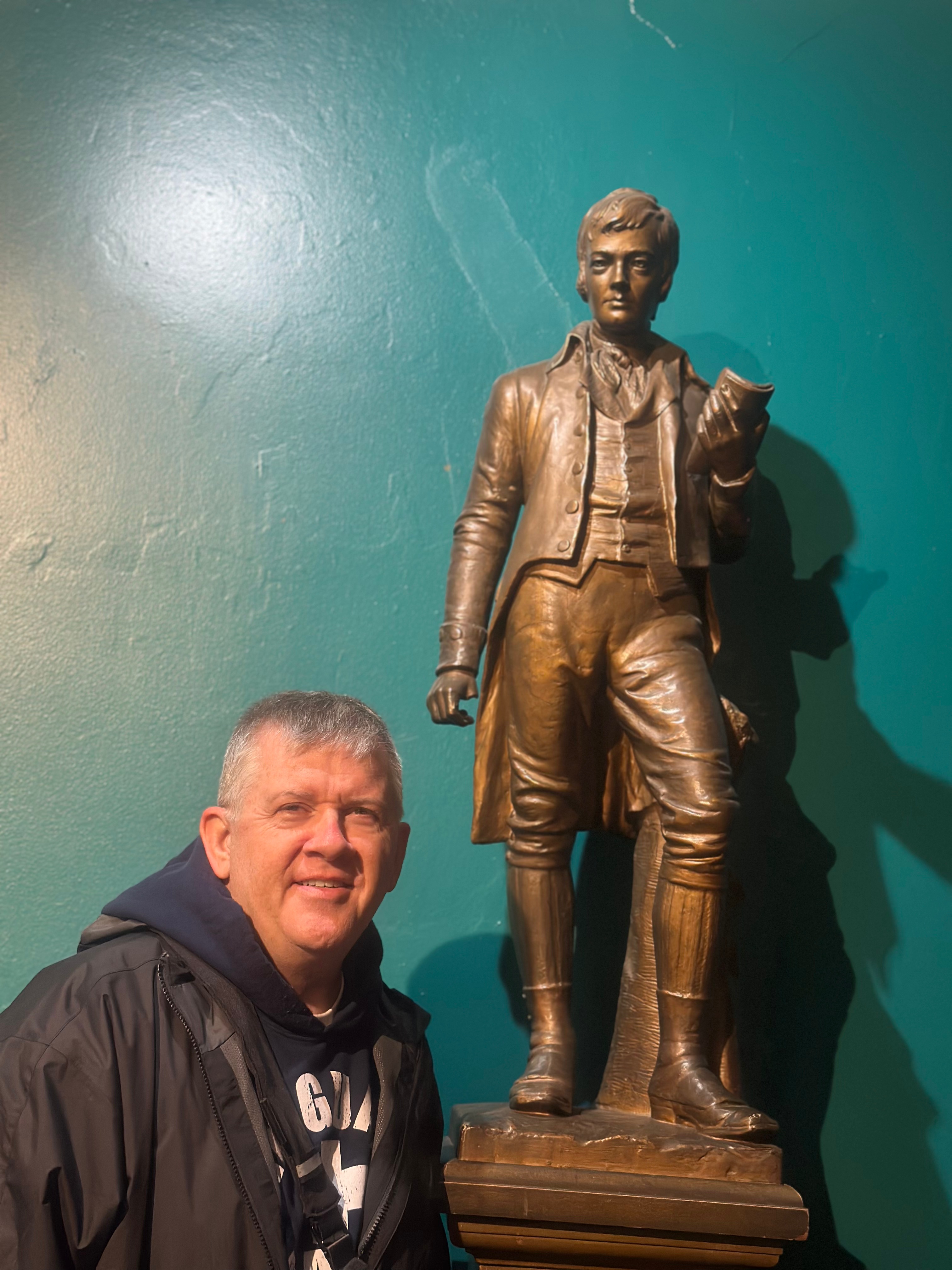 We met up with Blythe and visited The Writers’ Museum, which featured exhibitions that focus on three men who are generally considered the greatest Scottish writers: Sir Walter Scott, Robert Louis Stevenson, and Robert Burns. I’ve not read their work but wanted to visit the Burns exhibit in honor of my cousin Jim Couch, who passed away in 2023. Jim, a college English professor, was one of the nicest, kindest, smartest men I’ve known; Burns was his favorite writer, so visiting the Burns exhibit and sharing photos with Jim’s daughter Deborah was a good way to honor his memory.