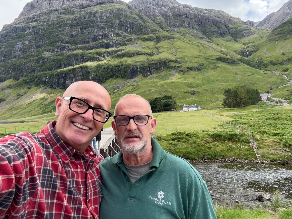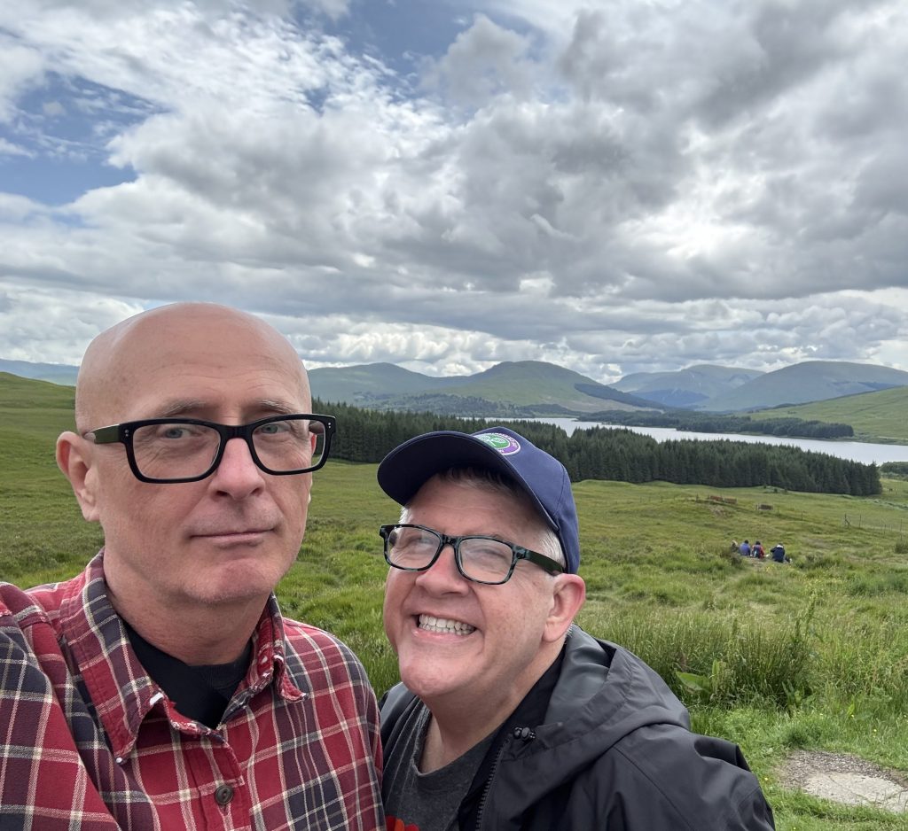 Ron and I hauled our carry-ons and backpacks to the meeting point for our 3-day/2-night tour of the Highlands and Isle of Skye through Timberbush Tours. A Timberbush staff member (who looked like a young Freddie Mercury) greeted us and directed us to walk farther down the sidewalk to wait for our van, which appeared just before 9:00 a.m. As the departure time neared, our driver Andrew loaded our luggage, and we climbed aboard the van. We had an eclectic tour group: a family of four, three solo travelers, a few couples, a mother/daughter pair, and a mother/son pair.