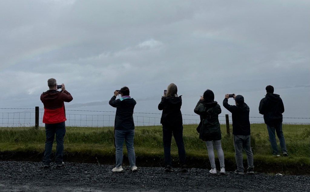 While we were riding along, Andy (the physics teacher, not the driver) asked if there were any rainbows visible (considering the amount of mist in the sky). As a group, we started scanning the skies with hopeful hearts. Literally seconds later, a wonderfully complete rainbow appeared almost immediately off to the left of the bus. Andrew (the guide, not to be confused with the physics teacher, although incredibly bright and gifted as well) whipped us off to the side of the road and folks disappeared from the bus like a fire drill! As everyone laughed at the ensuing excitement, I couldn’t help but catch a pic of everyone catching their own pics of the Rainbow Connection……eegits!