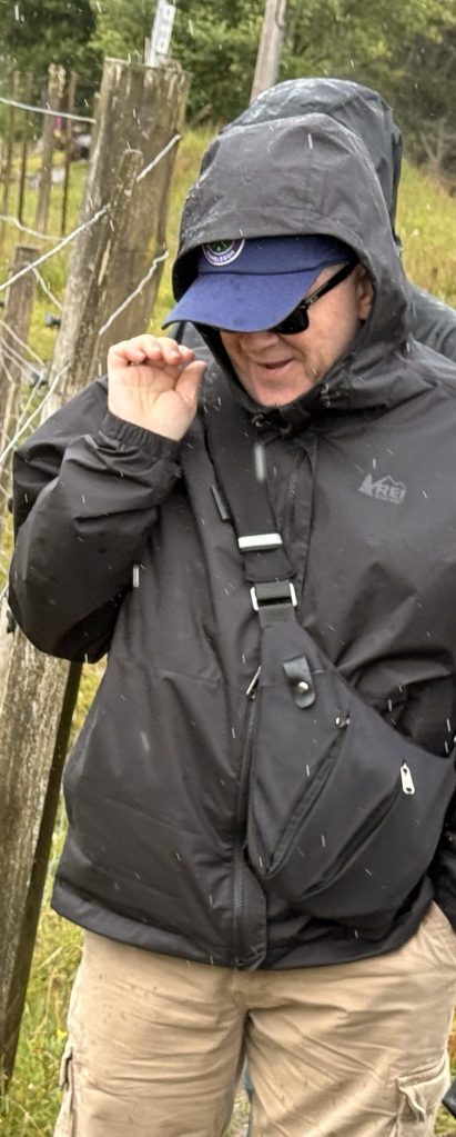 The weather — after running amok in the cemetery — began to turn downward; while we stopped again here and there, the misting rains kept us from straggling too far from the van. Kirk and I popped out briefly at each turnout but were consistently back inside before everyone except for the young man quietly streaming anime on his phone. After talking with him briefly, I added a new series to my Crunchyroll list while Kirk sat beside me unveiling Look # 2 (with an added eyeroll for good measure).