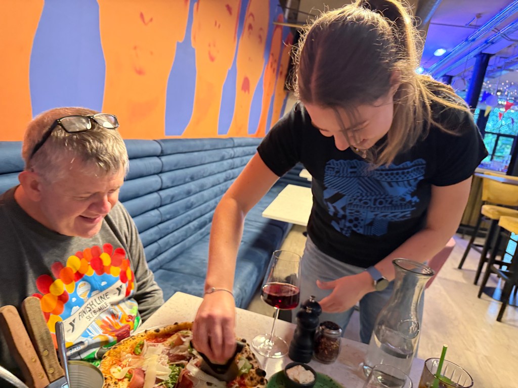 Everything was super-tasty, especially the focaccia!! The pizza was a unique flavor combination for us: prosciutto cotto and fungi! Sharing an oopsie doodle of a pizza story from a previous vacation, we shared a good laugh with server Maddie when our pizza arrived uncut. Being the pro, she snatched up a pizza cutter and (Bob’s your family member that identifies as “Uncle”), she had us fixed right up!