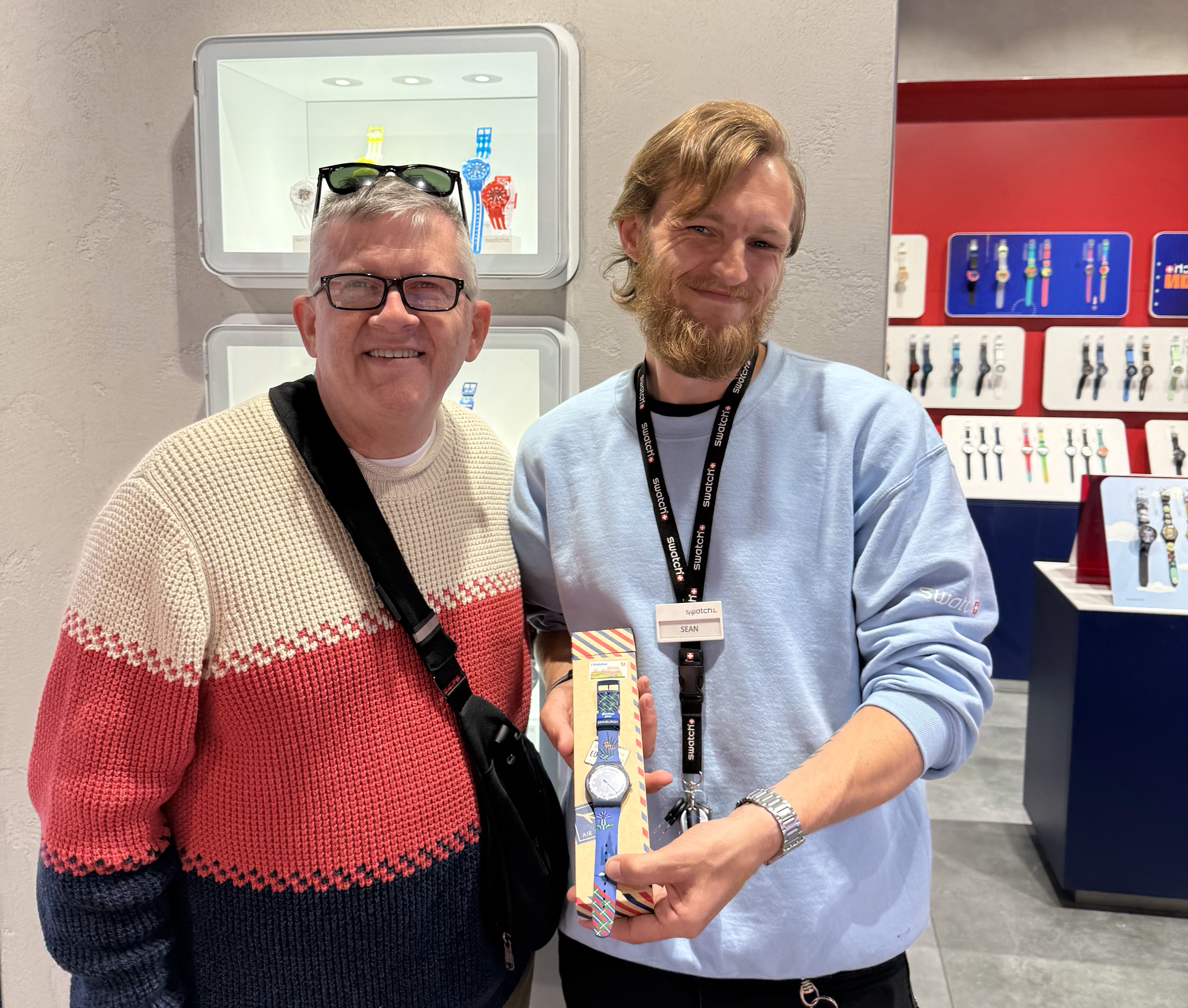 The highlight of the day for me, though, was my purchase at Swatch. We entered their newly renovated store on Princes Street and met store manager Sean and salesperson Julia, telling them that I wanted to look at the Edinburgh destination watch — then Julia informed us that Sean had co-designed the watch. Sean removed the watch from the wall for a closer look, and it’s awesome: a dark face, white numbers, and a blue band that features iconic Scottish images: Nessie, bagpipes, the thistle, Edinburgh Castle, and Sean’s family tartan and hunting tartan. He graciously signed the box for me, so thank you, Sean Mark McGregor Moffat! You made my day!<<<<<<<<<<<<<<<<<<<<<<<<<<<<<>>>>>>>>>>>>>>>>>>>>>>>><<<<<<<<<<<<<<<<<<<<<<<<<<<<<>>>>>>>>>>>>>>>>>>>>>>>>